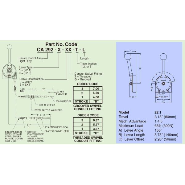 This light duty lever controls VLD control lever with available locking detents, offering a 4.5 to 1 mechanical advantage. Adjustable friction control with 2-bolt mounting scheme. Robust cast alloy weatherproof assembly in black finish with chrome steel lever and black plastic handle.